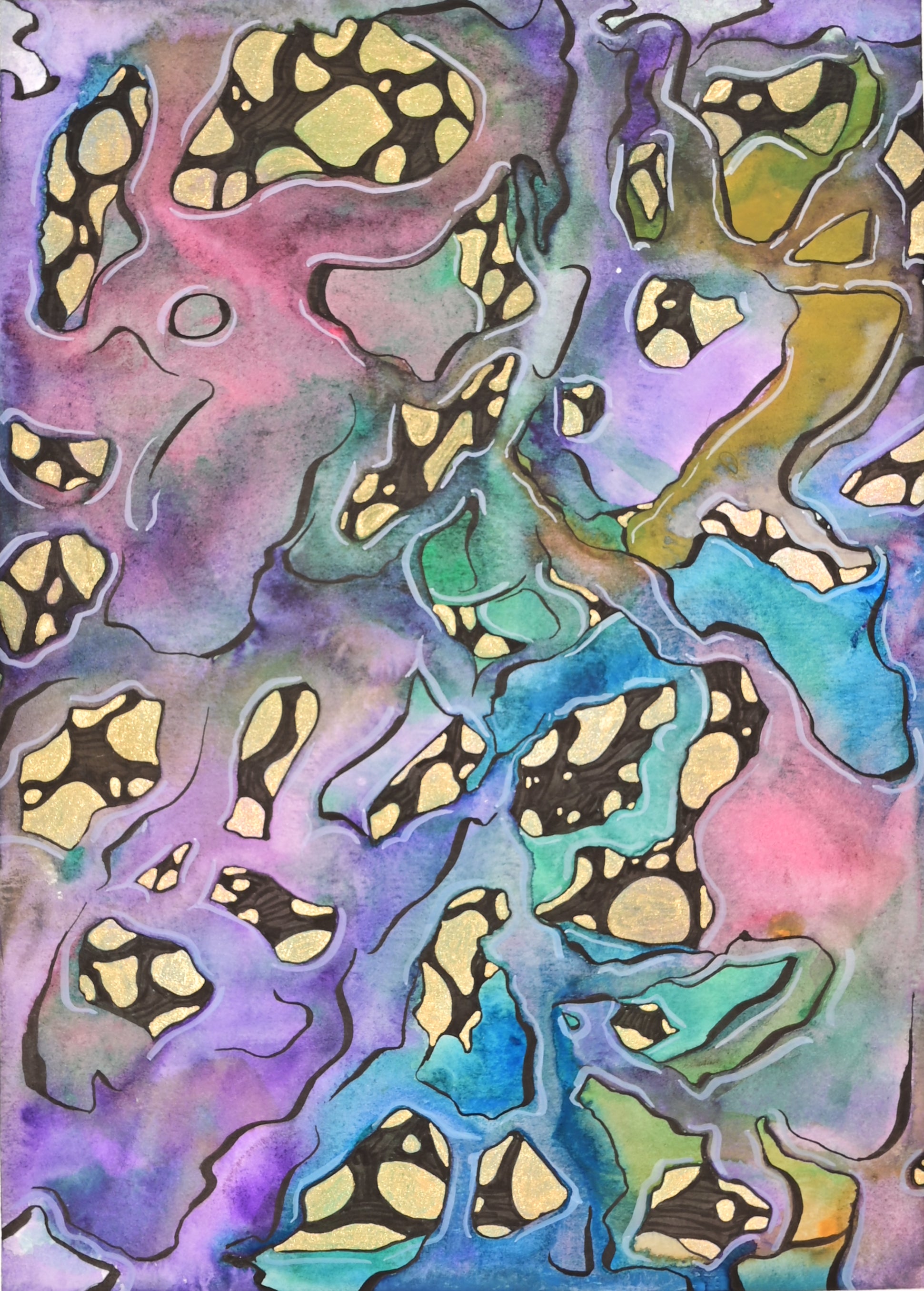 The original watercolor painting "Presence as Respiratory Practice" by Madelaine Hunter Millar, which features squishing clouds of rainbow material and shadows over a golden backdrop. 9x12 inches, sold unframed; created February 2023.
